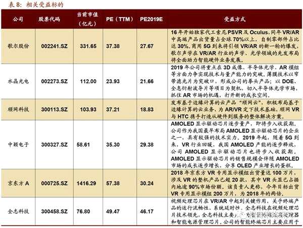5G助力VR/AR乘勢(shì)啟航。回顧VR/AR過去幾年的發(fā)展歷程,上一波虛擬(增強(qiáng))現(xiàn)實(shí)的熱炒是在14-15年,伴隨4G移動(dòng)紅利,但很快因?yàn)楦鞣N原因泡沫破裂。上一波熱潮使得消費(fèi)者對(duì)VR/AR有了初步認(rèn)識(shí),該時(shí)期由于技術(shù)不成熟,導(dǎo)致長(zhǎng)時(shí)間VR/AR沉浸感客戶體驗(yàn)不佳,產(chǎn)業(yè)并未能持續(xù)井噴式增長(zhǎng)。其中VR/AR產(chǎn)品因?yàn)閹捄脱訒r(shí)的因素導(dǎo)致渲染能力不足、互動(dòng)體驗(yàn)不強(qiáng)和終端移動(dòng)性差、分辨率和刷新率低等痛點(diǎn)問題,一直遏制行業(yè)發(fā)展的最大短板,阻礙了其在消費(fèi)領(lǐng)域的大規(guī)模放量。今天,VR/AR行業(yè)瓶頸已經(jīng)基本解決,市場(chǎng)也出現(xiàn)了回暖跡象。隨著5G的到來,5G高速和超低時(shí)延的特性將完美應(yīng)對(duì)VR/AR發(fā)展的短板。商用牌照的發(fā)放將帶領(lǐng)5G逐漸進(jìn)入放量階段,疊加國(guó)家通信政策利好以及VR/AR行業(yè)的回暖,我們認(rèn)為VR/AR將是大勢(shì)所趨。隨著行業(yè)應(yīng)用進(jìn)一步展開和深入,細(xì)分領(lǐng)域消費(fèi)場(chǎng)景不斷得到豐富,新技術(shù)的成熟和普及將為市場(chǎng)的持續(xù)增長(zhǎng)賦能。2018年以來,包括微軟、蘋果、谷歌等巨頭爭(zhēng)相加碼VR/AR市場(chǎng),19年進(jìn)入新品發(fā)布期。全年國(guó)內(nèi)外廠商預(yù)計(jì)發(fā)布10余款A(yù)R新品,三星、華為均透露在19年年內(nèi)發(fā)布VR產(chǎn)品,且新品性能大幅提升。因此,5G牌照發(fā)放后,第一階段場(chǎng)景的最大應(yīng)用就是VR/AR產(chǎn)業(yè),這是一個(gè)萬億級(jí)別的產(chǎn)業(yè),在產(chǎn)業(yè)鏈公司中的AR微顯示、光學(xué)、感知交互板塊技術(shù)更新突破后,廠商開始積極布局AR量產(chǎn)產(chǎn)能,建議重點(diǎn)關(guān)注VR/AR主題。