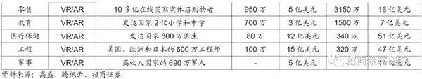 而根據(jù)高盛的VR報(bào)告,認(rèn)為VR/AR技術(shù)可以應(yīng)用到9大領(lǐng)域:視頻游戲、事件直播、視頻娛樂、醫(yī)療保健、房地產(chǎn)、零售、教育、工程和軍事,并對(duì)9大應(yīng)用領(lǐng)域的用戶和軟件營(yíng)收規(guī)模進(jìn)行了預(yù)測(cè)。