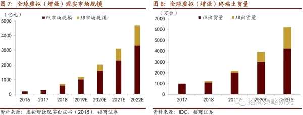 全球虛擬現(xiàn)實(shí)市場(chǎng)快速發(fā)展,終端出貨量上升態(tài)勢(shì)明顯。2018年全球虛擬現(xiàn)實(shí)市場(chǎng)規(guī)模超過700億元人民幣,同比增長(zhǎng)126%。預(yù)計(jì)2020年全球虛擬現(xiàn)實(shí)產(chǎn)業(yè)規(guī)模將超過2000億元,2017-2022年全球虛擬現(xiàn)實(shí)產(chǎn)業(yè)規(guī)模年均復(fù)合增長(zhǎng)率將超過70%,VR為占據(jù)主體地位,AR增速顯著。在終端整機(jī)方面,2018年全球終端出貨量超過1200萬臺(tái),預(yù)計(jì)到2020年整體終端出貨量接近4000萬臺(tái)。