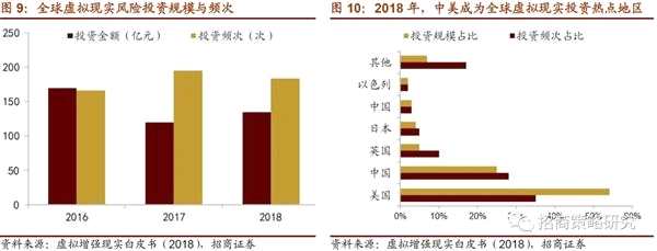 2018年全球虛擬現(xiàn)實(shí)風(fēng)險(xiǎn)投資金額增長(zhǎng)由負(fù)入正,投資頻次變化不大。2016年全球虛擬現(xiàn)實(shí)初創(chuàng)公司獲得風(fēng)險(xiǎn)資本投資總額超過170億元,雖然2017年風(fēng)險(xiǎn)投資金額約減少三分之一,但投資頻次增長(zhǎng)近二成,2018年風(fēng)險(xiǎn)投資頻次基本穩(wěn)定,投資總額調(diào)整回升至135億元,單筆投資均值低于2016產(chǎn)業(yè)元年億元規(guī)模,但較之2017年增幅高達(dá)18%。從地域分布來看,中美成為投資熱點(diǎn)地區(qū)。2018年獲得風(fēng)險(xiǎn)投資的公司中,35%的總部位于美國(guó),28%位于中國(guó)大陸,并分別獲得54%、25%的資金,中美繼續(xù)保持風(fēng)險(xiǎn)投資市場(chǎng)主導(dǎo)地位。