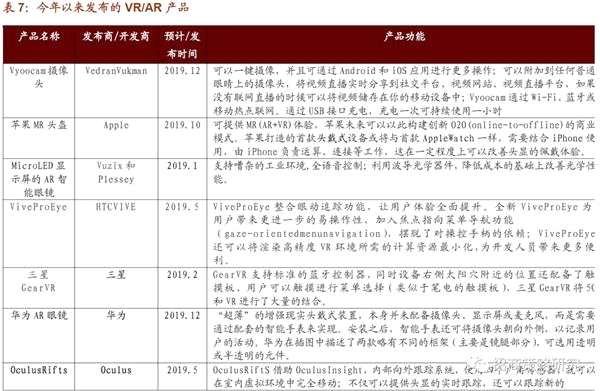 Oculus/Facebook已于19年春季發(fā)售Quest和RiftSHTC將于19年Q2發(fā)布FocusPlus、VivoProEye、Cosmos,此外國(guó)內(nèi)的創(chuàng)維發(fā)布VR一體機(jī)于19年4月上市,愛奇藝等內(nèi)容廠商與【中國(guó)聯(lián)通(600050)、股吧】合作提供內(nèi)容體驗(yàn)。AR方面,19MWC大會(huì)上,Microsoft發(fā)布HoloLens2開啟企業(yè)級(jí)AR頭顯“2.0時(shí)代”,Vuzix發(fā)布AR眼鏡M400標(biāo)志著曉龍XR1平臺(tái)在AR上的落地、LentinAR亮相8KAR眼鏡原型機(jī)揭示了Micro-OLED的高分辨率能力,同時(shí)2019年各大品牌密集發(fā)布新機(jī)(RokidGlassS、RealMax乾、GoogleGlassEE2、Nreallight、VuzixM400),有望加速產(chǎn)品滲透推廣。