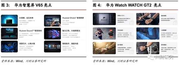 智慧終端實現(xiàn)連動發(fā)展,帶來高度人機互動。除Mate 30系列外,華為同時推出智慧屏V65和Watch GT2。智慧屏V65采用4K量子點屏,刷新率120Hz,使用了8+1+1音響系統(tǒng),搭載可升降AI攝像頭。Watch GT2采用一體化3D玻璃設計,應用最新發(fā)布的麒麟A1芯片,為首款同時支持藍牙5.1和低功率藍牙5.1的可穿戴芯片,續(xù)航時長可達15天。華為智能設備與手機間可高度連動,未來5G建設完善下,各類智能終端如AR/VR穿戴設備、智能家居、網(wǎng)聯(lián)無人機有望實現(xiàn)后周期的進一步發(fā)展。