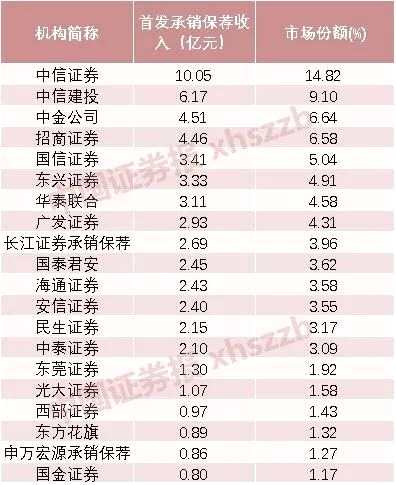 從單家收入情況看,中信證券憑借10.05億元的收入規(guī)模穩(wěn)坐頭把交椅;第二至第十名分別是中信建投證券、中金公司、招商證券、國信證券、東興證券、華泰聯(lián)合證券、廣發(fā)證券、長江證券承銷保薦、國泰君安證券,其IPO承銷及保薦收入分別為6.17億元、4.51億元、4.46億元、3.41億元、3.33億元、3.11億元、2.93億元、2.69億元、2.45億元。