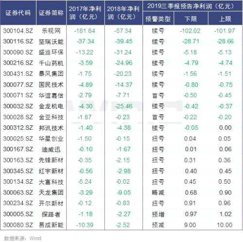 Wind數(shù)據(jù)顯示,自2017年至2018年連續(xù)兩年凈利潤虧損的創(chuàng)業(yè)板公司共計19家,其中有9家公司預計在今年三季度實現(xiàn)盈利,另外10家三季報均業(yè)績預虧。