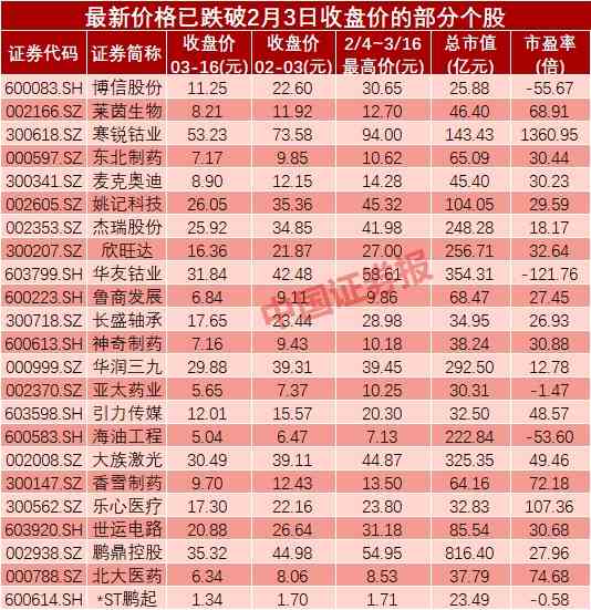 【萊茵生物(002166)、股吧】居次,最新收盤價(jià)8.21元,較2月初11.92元的價(jià)格跌超30%;另有包括寒銳鈷業(yè)、東北制藥、麥克奧迪、姚記科技、杰瑞股份、欣旺達(dá)和華友鈷業(yè)等在內(nèi)的數(shù)十股也已跌破2月初的價(jià)格。