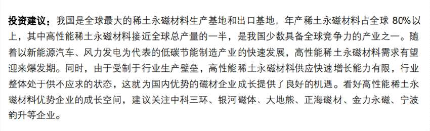 平安證券分析,乘低碳經(jīng)濟(jì)發(fā)展之風(fēng),高性能稀土永磁材料需求有望迎來爆發(fā)。高性能稀土永磁材料被廣泛應(yīng)用于節(jié)能環(huán)保制造產(chǎn)業(yè)等低碳經(jīng)濟(jì)領(lǐng)域,隨著世界各國(guó)家紛紛大力投資低碳節(jié)能環(huán)保制造產(chǎn)業(yè),并大力推動(dòng)綠色節(jié)能環(huán)保產(chǎn)品消費(fèi),以新能源車、風(fēng)力發(fā)電、節(jié)能家電、機(jī)器人和智能制造等為代表的新興產(chǎn)業(yè)快速發(fā)展,高性能稀土永磁材料需求有望迎來高速增長(zhǎng)。