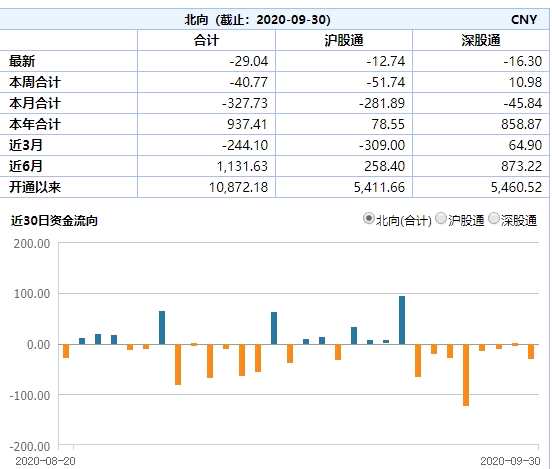 北向資金則連續(xù)第8個交易日離場。數(shù)據(jù)顯示,9月30日北向資金單日再度凈流出29.04億元。整個9月,北向資金累計凈流出327.73億元,年內(nèi)規(guī)模僅次于3月。值得注意是,北向資金9月從滬市“撤離”更多,滬股通資金9月凈流出超280億元,而深股通資金則凈流出不足46億元。