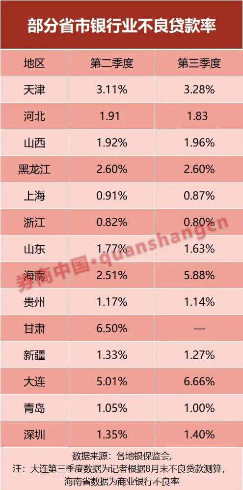 值得注意的是,還有地區(qū)銀行業(yè)資產質量明顯惡化。截至今年8月末,大連市銀行業(yè)不良率高達6.66%,較年初提升1.8個百分點。9月末,海南省商業(yè)銀行不良貸款率達5.88%,單季度上升了3.37個百分點。