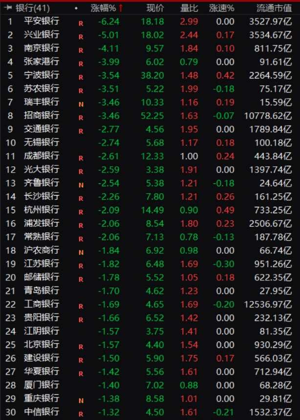 銀行股全線飄綠,平安、興業(yè)跌幅超5%