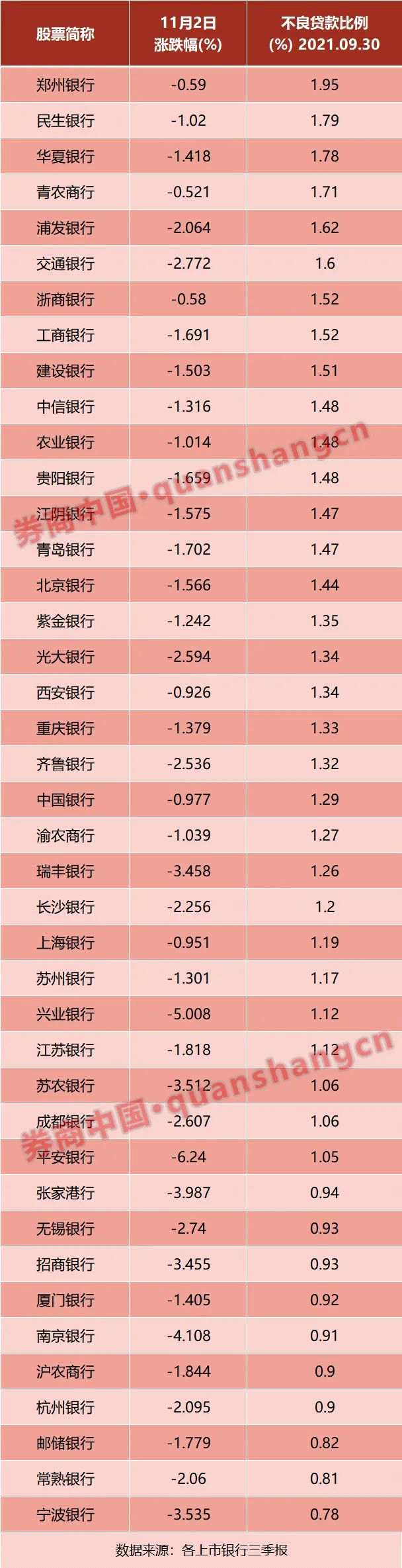據(jù)機構測算,三季度末上升銀行整體不良率為1.39%,環(huán)比下降0.02個百分點;國有大行、股份行、城商行和農商行等類別銀行資產質量全線改善。上市銀行中,僅青島農商行、西安銀行、浙商銀行及【重慶銀行(601963)、股吧】4家銀行的不良率較去年末有所抬升。