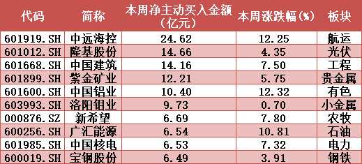 凈主動買入方面,本周主力資金的標的從板塊上看比較零亂,但主要還是集中在受俄烏局勢影響的幾個領(lǐng)域。例如受黃金價格上漲影響的紫金礦業(yè)、受大宗商品漲價影響的中國鋁業(yè)/洛陽鉬業(yè)/【廣匯能源(600256)、股吧】等。當然被凈主動買入金額最高的是受海運價格上漲影響的中遠???,達到近25億元。而股價表現(xiàn)最好的是紫金礦業(yè),本周創(chuàng)出了去年9月底以來的5個多月新高,被凈主動買入12億元。