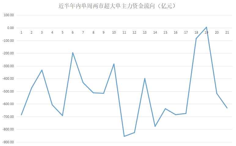 ▲近半年內(nèi)單周兩市超大單主力資金流向