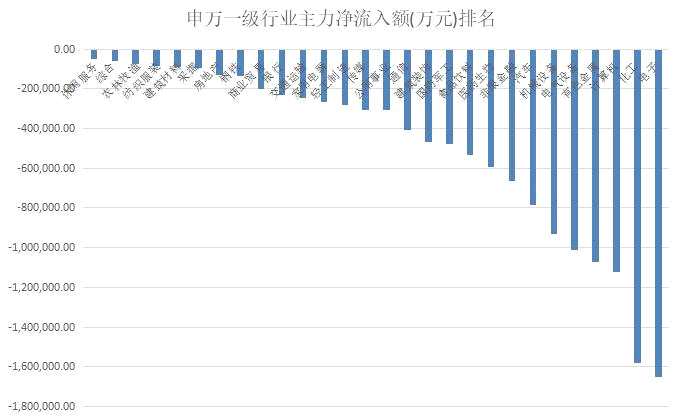 本周28個申萬一級行業(yè)再度全軍覆沒,沒有一個行業(yè)出現(xiàn)主力凈流入。和過去一樣,休閑服務和綜合行業(yè)的凈流出金額最低。