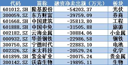 在融資凈賣出個股方面,融資客集中拋出行業(yè)龍頭白馬股。與主力資金的操作正好相反,隆基股份被融資凈賣出5.4億元居首,但在寧德時代上又與主力資金保持一致地賣出。另外一只創(chuàng)業(yè)板的權(quán)重股東方財富也被融資凈賣出近4億元。