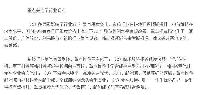 天風(fēng)證券指出,(1)多因素影響化工子行業(yè)2022年景氣程度變化,農(nóng)藥行業(yè)在耕地面積預(yù)期提升、糧價(jià)維持在較高水平、國(guó)內(nèi)供給有序且四季度價(jià)格走高之下2022年整體盈利水平有望改善,重點(diǎn)推薦【揚(yáng)農(nóng)化工(600486)、股吧】、潤(rùn)豐股份、廣信股份、利民股份;輪胎行業(yè)景氣見(jiàn)底,新能源領(lǐng)域帶來(lái)發(fā)展機(jī)遇,建議關(guān)注賽輪輪胎、森麒麟。