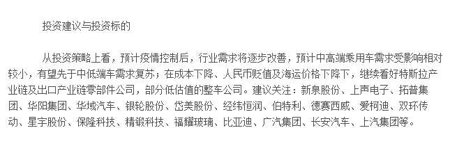 另外,東方證券表示,從投資策略上看,預(yù)計(jì)疫情控制后,行業(yè)需求將逐步改善,預(yù)計(jì)中高端乘用車(chē)需求受影響相對(duì)較小,有望先于中低端車(chē)需求復(fù)蘇;在成本下降、人民幣貶值及海運(yùn)價(jià)格下降下,繼續(xù)看好特斯拉產(chǎn)業(yè)鏈及出口產(chǎn)業(yè)鏈零部件公司,部分低估值的整車(chē)公司。