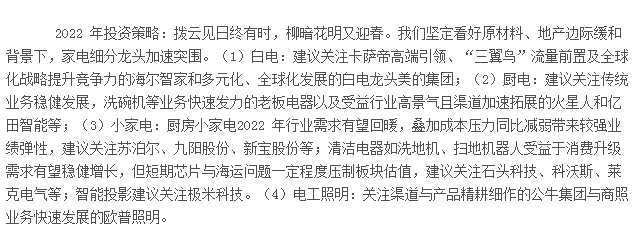國金證券表示,當(dāng)前時(shí)點(diǎn)家電板塊整體處于估值底部,建議把握兩條主線:1)成長性與確定性兼具的新興家電賽道,包括掃地機(jī)、集成灶、投影儀;一季度業(yè)績持續(xù)驗(yàn)證,現(xiàn)階段建議積極布局。推薦關(guān)注技術(shù)領(lǐng)先且具有消費(fèi)品全方位壁壘的家用智能微投龍頭【極米科技(688696)、股吧】。集成灶滲透率提升邏輯持續(xù)得到數(shù)據(jù)驗(yàn)證,重點(diǎn)推薦具備長期龍頭戰(zhàn)略格局眼光、緊握強(qiáng)品牌營銷和渠道力兩大廚電行業(yè)龍頭核心要素、規(guī)模快速擴(kuò)張的火星人。推薦關(guān)注具備較強(qiáng)產(chǎn)品力,少東家上任變革成效持續(xù)體現(xiàn)的億田智能。