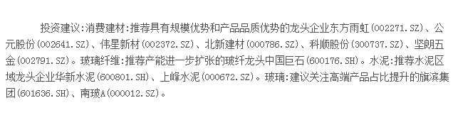 中國銀河證券認(rèn)為,受益于地產(chǎn)政策的持續(xù)發(fā)力,竣工端將逐步恢復(fù),疊加舊改需求的釋放,消費(fèi)建材需求仍有提升空間。此外,在碳中和大背景下,建筑能耗標(biāo)準(zhǔn)的提升有助于高品質(zhì)綠色建材應(yīng)用的普及和推廣,具有規(guī)模優(yōu)勢和產(chǎn)品品質(zhì)優(yōu)勢的行業(yè)龍頭將受益,建議關(guān)注消費(fèi)建材龍頭企業(yè)。
