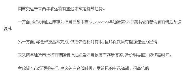 國泰君安證券認(rèn)為,未來兩年油運(yùn)將有望迎來確定復(fù)蘇趨勢。一方面,全球原油去庫存先行且已基本完成,2022-2023年油運(yùn)需求將隨終端消費(fèi)恢復(fù)而滯后加速復(fù)蘇,另一方面,浮倉釋放基本完成,供給彈性相對有限,且環(huán)保政策有望加速運(yùn)力出清。未來兩年油運(yùn)市場將有望隨著原油終端消費(fèi)恢復(fù)而逐步復(fù)蘇,運(yùn)價(jià)明顯回升應(yīng)仍需時(shí)間。考慮資本市場預(yù)期先行,建議關(guān)注底部時(shí)機(jī)。受益標(biāo)的【中遠(yuǎn)海能(600026)、股吧】、招商輪船。