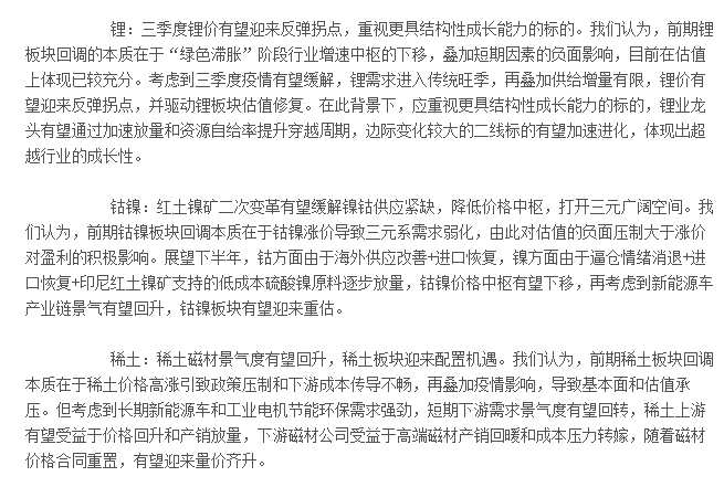 中泰證券表示,新能源上游原材料稀土磁材鋰鈷銅箔鋁箔等,短時(shí)間因?yàn)橐咔椤⑽锪鞯纫蛩爻霈F(xiàn)供需雙弱局面,上海擬有序推動(dòng)企業(yè)復(fù)工復(fù)產(chǎn),產(chǎn)業(yè)鏈景氣度或?qū)⒅鸩叫迯?fù),中長(zhǎng)期三年景氣上行周期大方向不改,產(chǎn)業(yè)景氣度方向明確。核心標(biāo)的:贛鋒鋰業(yè)、天齊鋰業(yè)、中礦資源、永興材料、雅化集團(tuán)、華友鈷業(yè)、洛陽(yáng)鉬業(yè)、北方稀土、盛和資源、【正海磁材(300224)、股吧】、金力永磁、大地熊、鼎勝新材、諾德股份、嘉元科技等。