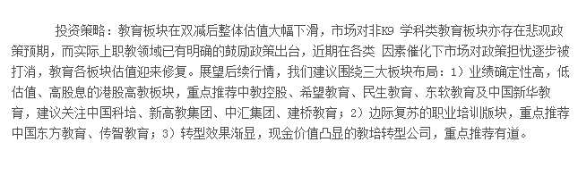 中信證券指出,近期教育各板塊迎來(lái)反彈,市場(chǎng)對(duì)板塊悲觀政策預(yù)期有所緩和,重心逐步回歸公司基本面和資產(chǎn)價(jià)值。展望后續(xù)行情,我們建議圍繞三大板塊布局:1)業(yè)績(jī)確定性高,低估值、高股息的港股高教板塊,重點(diǎn)推薦中教控股、希望教育、民生教育、東軟教育及中國(guó)新華教育,建議關(guān)注中國(guó)科培、新高教集團(tuán)、中匯集團(tuán)、建橋教育;2)邊際復(fù)蘇的職業(yè)培訓(xùn)板塊,重點(diǎn)推薦中國(guó)東方教育、【傳智教育(003032)、股吧】;3)轉(zhuǎn)型漸有起色,現(xiàn)金價(jià)值凸顯的教培轉(zhuǎn)型公司,重點(diǎn)推薦有道。