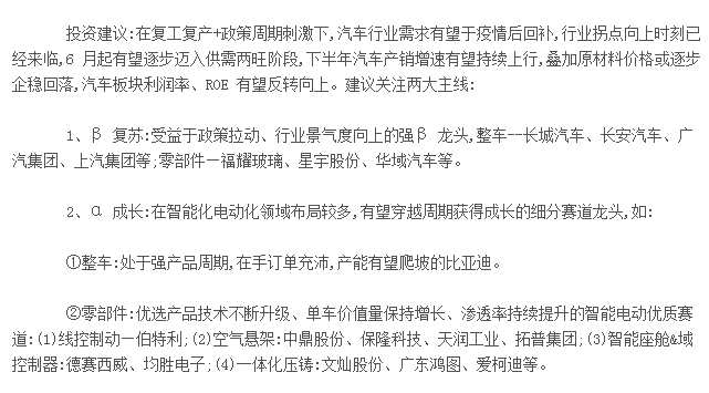 信達(dá)證券表示,在復(fù)工復(fù)產(chǎn)+政策周期刺激下,汽車行業(yè)需求有望于疫情后回補(bǔ),行業(yè)拐點(diǎn)向上時(shí)刻已經(jīng)來(lái)臨,6 月起有望逐步邁入供需兩旺階段,下半年汽車產(chǎn)銷增速有望持續(xù)上行,疊加原材料價(jià)格或逐步企穩(wěn)回落,汽車板塊利潤(rùn)率、ROE 有望反轉(zhuǎn)向上。