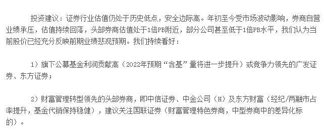 西部證券提到,證券行業(yè)估值仍處于歷史低點(diǎn),安全邊際高。年初至今受市場(chǎng)波動(dòng)影響,券商自營(yíng)業(yè)績(jī)承壓,估值持續(xù)回落,頭部券商估值處于1倍PB附近,部分公司甚至低于1倍PB水平,我們認(rèn)為當(dāng)前股價(jià)已經(jīng)充分反映前期業(yè)績(jī)悲觀預(yù)期。