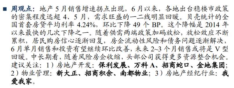 東吳證券表示,地產(chǎn)5月銷售增速拐點(diǎn)出現(xiàn),6月以來(lái),各地出臺(tái)穩(wěn)樓市政策的密集程度遠(yuǎn)超4、5月,需求旺盛的一二線明顯回暖。貝殼統(tǒng)計(jì)的全國(guó)首套房貸平均利率4.24%,環(huán)比下降49個(gè)BP.這個(gè)降幅是2014年以來(lái)最快的幾次下降之一。隨著供需兩端政策加碼放松,放松效應(yīng)不斷累積,居民購(gòu)房信心逐漸回復(fù),房企流動(dòng)性風(fēng)險(xiǎn)和債務(wù)問(wèn)題逐漸解決,6月單月銷售和投資有望繼續(xù)環(huán)比改善,未來(lái)2~3個(gè)月銷售或?qū)⑹荲型回暖。中長(zhǎng)期看,隨著風(fēng)險(xiǎn)房企收縮,頭部公司獲得更多資源整合機(jī)會(huì)。