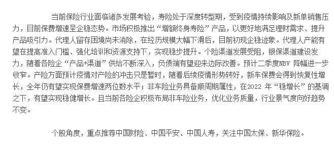 對(duì)于保險(xiǎn)板塊,長(zhǎng)城證券提到,隨著后續(xù)疫情形勢(shì)轉(zhuǎn)好,新車保費(fèi)會(huì)得到恢復(fù)性增長(zhǎng),全年仍有望實(shí)現(xiàn)保費(fèi)增速兩位數(shù)水平;非車險(xiǎn)業(yè)務(wù)具備順周期屬性,在2022年“穩(wěn)增長(zhǎng)”的基調(diào)之下,有望實(shí)現(xiàn)穩(wěn)健增長(zhǎng)。且當(dāng)前各險(xiǎn)企積極布局非車險(xiǎn)業(yè)務(wù),優(yōu)化業(yè)務(wù)質(zhì)量,行業(yè)景氣度向好趨勢(shì)不變。個(gè)股角度,重點(diǎn)推薦中國(guó)財(cái)險(xiǎn)、中國(guó)平安、中國(guó)人壽,關(guān)注中國(guó)太保、新華保險(xiǎn)。