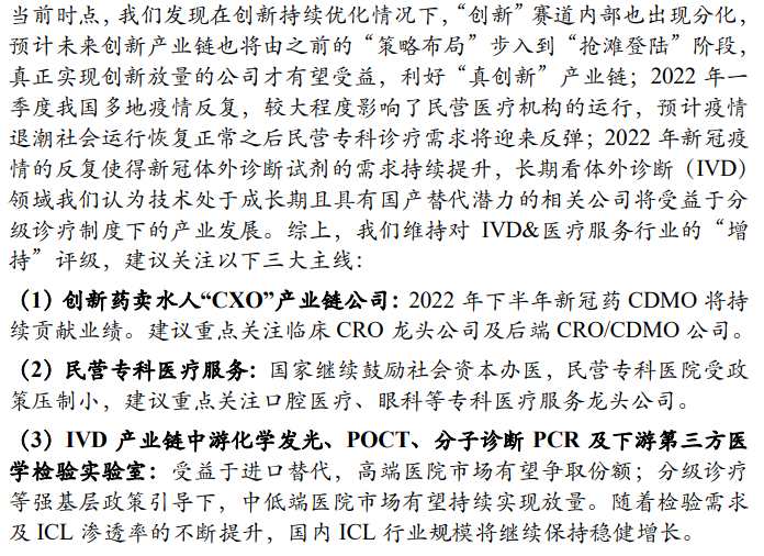 湘財(cái)證券表示,當(dāng)前時(shí)點(diǎn),我們發(fā)現(xiàn)在創(chuàng)新持續(xù)優(yōu)化情況下,“創(chuàng)新”賽道內(nèi)部也出現(xiàn)分化,預(yù)計(jì)未來(lái)創(chuàng)新產(chǎn)業(yè)鏈也將由之前的“策略布局”步入到“搶灘登陸”階段,真正實(shí)現(xiàn)創(chuàng)新放量的公司才有望受益,利好“真創(chuàng)新”產(chǎn)業(yè)鏈;2022年一季度我國(guó)多地疫情反復(fù),較大程度影響了民營(yíng)醫(yī)療機(jī)構(gòu)的運(yùn)行,預(yù)計(jì)疫情退潮社會(huì)運(yùn)行恢復(fù)正常之后民營(yíng)??圃\療需求將迎來(lái)反彈;2022年新冠疫情的反復(fù)使得新冠體外診斷試劑的需求持續(xù)提升,長(zhǎng)期看體外診斷(IVD)領(lǐng)域我們認(rèn)為技術(shù)處于成長(zhǎng)期且具有國(guó)產(chǎn)替代潛力的相關(guān)公司將受益于分級(jí)診療制度下的產(chǎn)業(yè)發(fā)展。