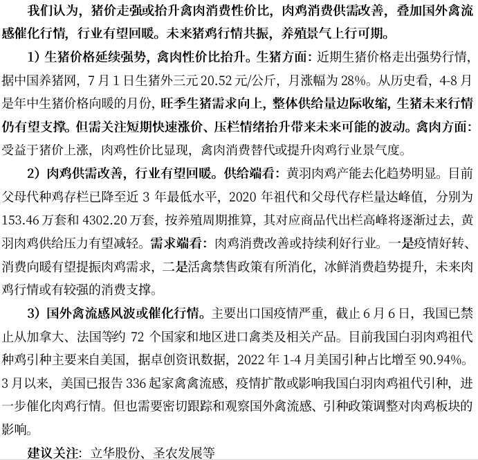 東亞前海證券提到,對(duì)于生豬養(yǎng)殖:連續(xù)兩次收儲(chǔ)全部流拍彰顯市場(chǎng)看漲情緒;前期產(chǎn)能去化效應(yīng)逐漸顯現(xiàn),下半年生豬供給或?yàn)橄陆第厔?shì),繼續(xù)支撐豬價(jià)上漲。建議關(guān)注動(dòng)物疫病防控優(yōu)秀、成本控制優(yōu)勢(shì)顯著、現(xiàn)金流較為充裕的養(yǎng)殖企業(yè)。對(duì)于種業(yè):中央及部門(mén)多措并舉保護(hù)國(guó)家糧食安全。轉(zhuǎn)基因技術(shù)有望為糧食安全提供新動(dòng)力。轉(zhuǎn)基因商業(yè)化進(jìn)程加快利好下,建議關(guān)注轉(zhuǎn)基因技術(shù)優(yōu)勢(shì)明顯、具有核心育種優(yōu)勢(shì)的龍頭種企。