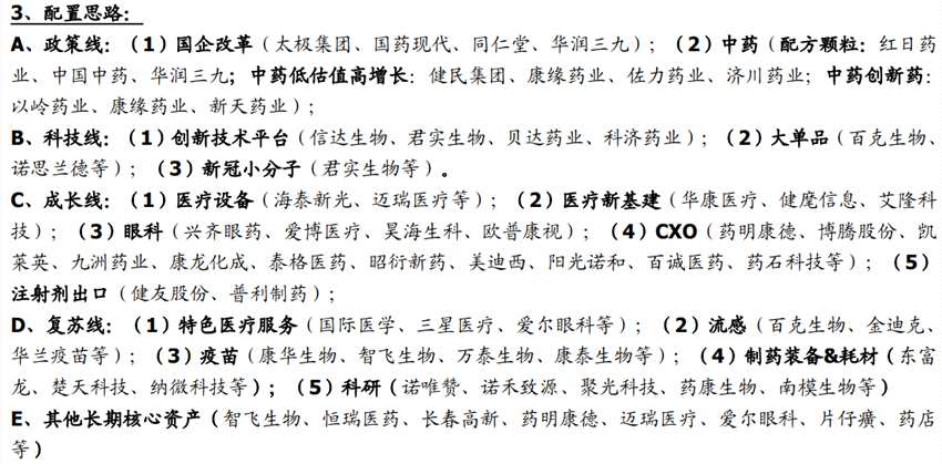國(guó)聯(lián)證券提到,展望7月,進(jìn)入業(yè)績(jī)預(yù)告的披露期,業(yè)績(jī)?cè)鲩L(zhǎng)仍然關(guān)注點(diǎn),我們建議關(guān)注疫苗/創(chuàng)【新產(chǎn)業(yè)(300832)、股吧】鏈/醫(yī)療服務(wù),1)疫苗:看好常規(guī)疫苗的批簽發(fā)恢復(fù),疊加對(duì)疫苗的認(rèn)知度后的疫苗企業(yè)的業(yè)績(jī)?cè)鲩L(zhǎng),重點(diǎn)推薦萬(wàn)泰生物、智飛生物;2)創(chuàng)新藥和高增長(zhǎng)的部分產(chǎn)業(yè)鏈,受益產(chǎn)品、政策、宏觀環(huán)境因素的改善,重點(diǎn)推薦藥明康德、皓元醫(yī)藥、九洲藥業(yè)、和元生物、藥康生物、諾唯贊、恒瑞醫(yī)藥、貝達(dá)藥業(yè)等,建議關(guān)注艾力斯;3)新版防控方案中封控時(shí)間縮短,大消費(fèi)轉(zhuǎn)暖場(chǎng)景下看好醫(yī)療服務(wù)的復(fù)蘇,重點(diǎn)推薦愛(ài)爾眼科、我武生物等。