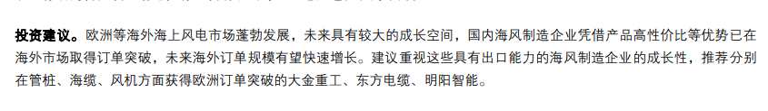 平安證券指出,歐洲等海外海上風(fēng)電市場蓬勃發(fā)展,未來具有較大的成長空間,國內(nèi)海風(fēng)制造企業(yè)憑借產(chǎn)品高性價比等優(yōu)勢已在海外市場取得訂單突破,未來海外訂單規(guī)模有望快速增長。建議重視這些具有出口能力的海風(fēng)制造企業(yè)的成長性,推薦分別在管樁、海纜、風(fēng)機(jī)方面獲得歐洲訂單突破的大金重工、東方電纜、明陽智能。