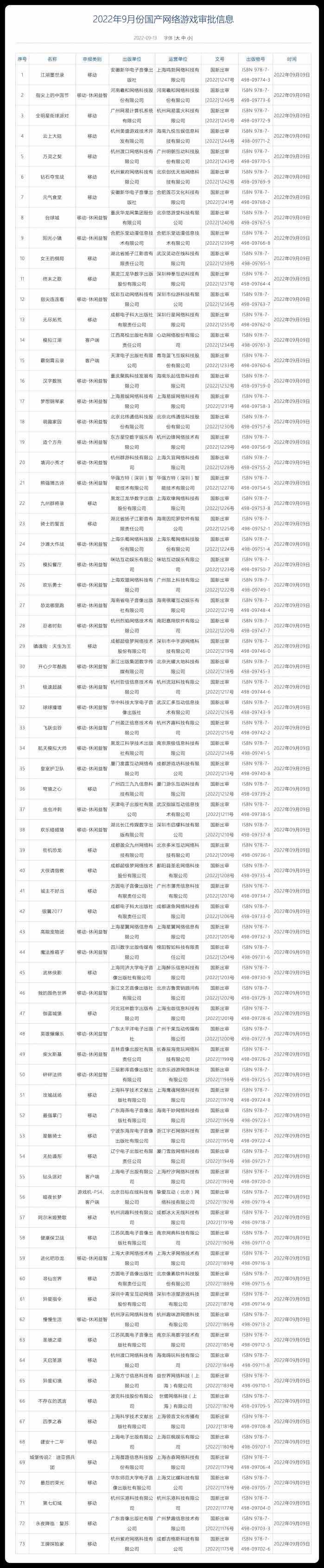 9月13日,國(guó)家新聞出版署公布了新一批國(guó)產(chǎn)網(wǎng)絡(luò)游戲?qū)徟畔?,?3款游戲過審,獲批版號(hào)中包括網(wǎng)易、心動(dòng)網(wǎng)絡(luò)、中手游、邊鋒等多家知名廠商的游戲。