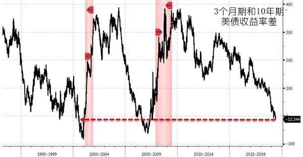 上周美國(guó)經(jīng)濟(jì)數(shù)據(jù)的糟糕表現(xiàn)也被視為美債收益率曲線倒掛的導(dǎo)火索。隔夜3個(gè)月期和10年期美國(guó)國(guó)債收益率息差再度大跌,已經(jīng)跌破-13個(gè)基點(diǎn),收益率曲線倒掛程度達(dá)到2007年7月以來(lái)的最高水平,這是美聯(lián)儲(chǔ)最看重的一個(gè)衰退指標(biāo)。