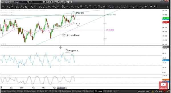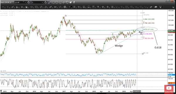 交易員羅布·科爾維爾(Rob Colville)表示,美元指數(shù)在上周四達(dá)到的近兩年高點(diǎn)處形成了看跌的針桿形態(tài)(pin-bar),并且同時(shí)觸及了上升楔型的上邊界,這意味著美元可能已經(jīng)見(jiàn)頂,隨時(shí)有可能轉(zhuǎn)向下跌。