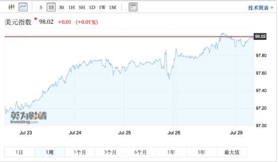 上周,在特朗普政府暫時(shí)放棄干涉美元及美國二季度國內(nèi)生產(chǎn)總值(GDP)好于預(yù)期的提振下,美元指數(shù)一度漲至近2個(gè)月新高,突破98關(guān)口。