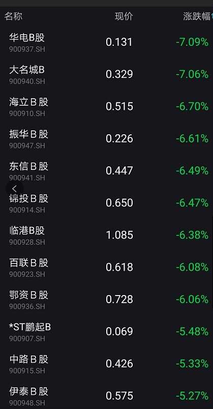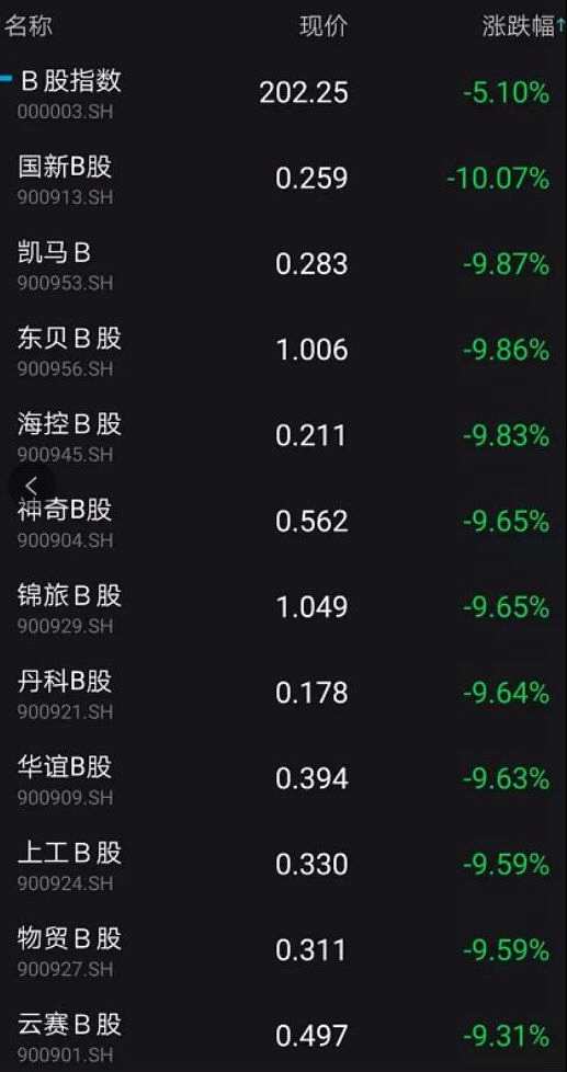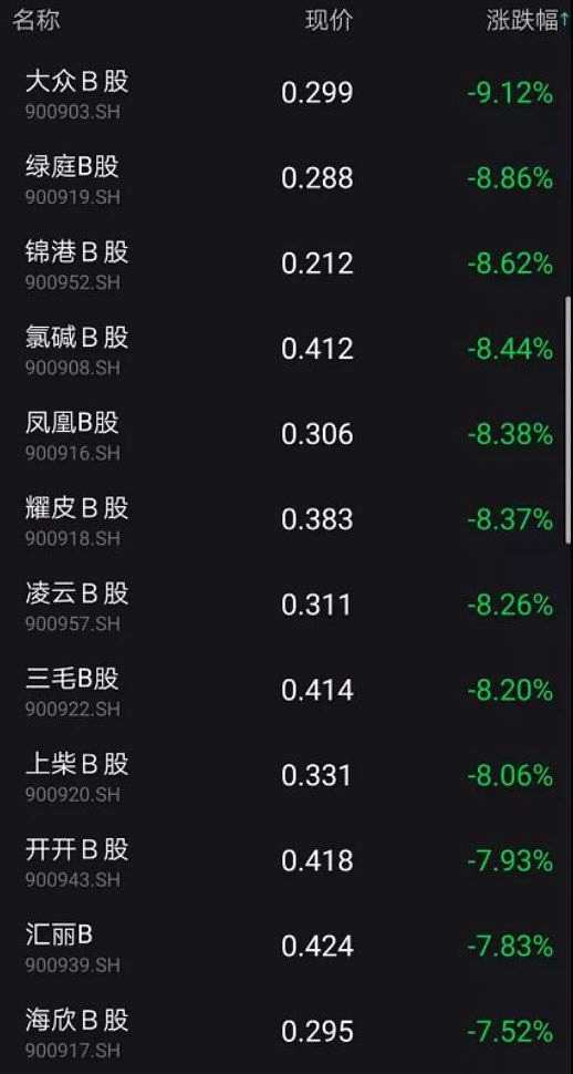 截至當天收盤,B股指數(shù)跌幅略有收窄,但仍超5%以上。12只B股跌幅超9%以上。
