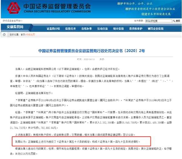 對此,寧波證監(jiān)局責令正瑞儲能改正,給予警告,并處以20萬元罰款。不過對于出借賬戶的李某和葉某是否進行了處罰,處罰書中并沒有明確披露。