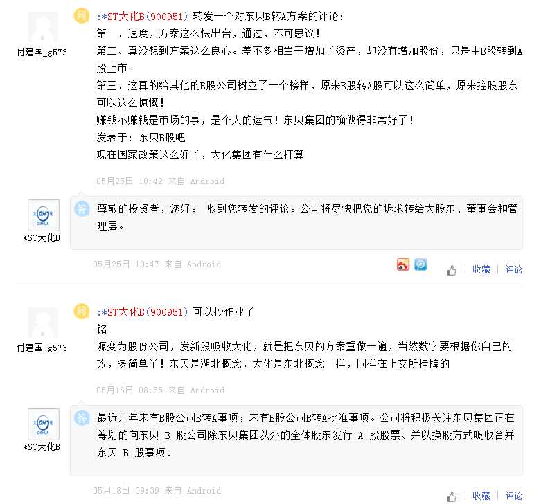 此前,有投資者在互動(dòng)平臺(tái)留言,希望公司能效仿東貝集團(tuán)B轉(zhuǎn)A。對(duì)此,*ST大化B 5月18日回復(fù)稱,將積極關(guān)注東貝B股“B轉(zhuǎn)A”事項(xiàng)。此后兩天,*ST大化B股價(jià)連續(xù)大漲。