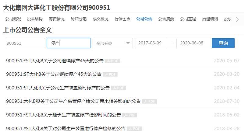 值得注意的是,*ST大化B多次發(fā)布停產(chǎn)公告。以停產(chǎn)為關(guān)鍵詞搜索公司相關(guān)公告,僅在2020年上半年,停產(chǎn)時(shí)間就達(dá)135天。公司主要生產(chǎn)裝置的較長(zhǎng)時(shí)間停產(chǎn),使公司面臨較大經(jīng)營(yíng)風(fēng)險(xiǎn)。