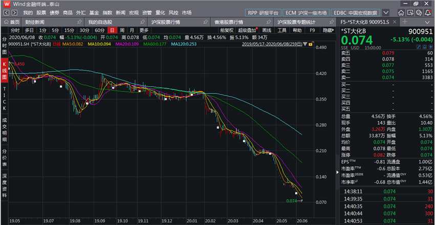 6月8日,*ST大化B收?qǐng)?bào)0.074元/股,該股收盤(pán)價(jià)連續(xù)20個(gè)交易日低于1元人民幣,這也標(biāo)志著*ST大化B成為繼東灃B退后,第二家因觸發(fā)面值退市條件而強(qiáng)制退市的純B股上市公司。