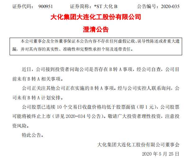 但隨后,5月25日晚,*ST大化B發(fā)布澄清公告稱,經(jīng)自查,公司目前未有B轉(zhuǎn)A相關(guān)事項(xiàng)。經(jīng)與公司實(shí)控人聯(lián)系詢問(wèn),公司未有B轉(zhuǎn)A計(jì)劃安排。