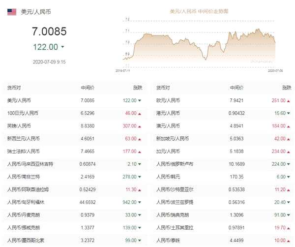 7月9日,人民幣兌美元中間價調升122個基點,報7.0085。前一交易日人民幣兌美元中間價報7.0207,16:30收盤價報7.0176,23:30夜盤收報7.0049。