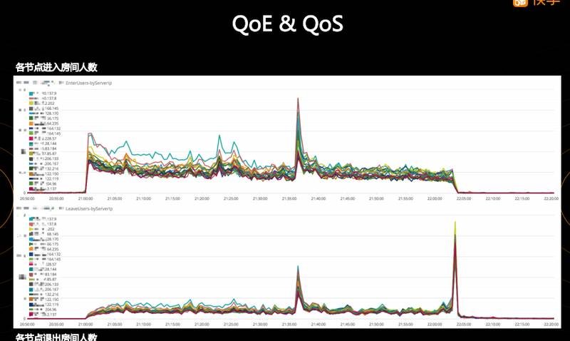 首先看看 QoE 數(shù)據(jù),左上角是快手某次直播房間的同時在線人數(shù)曲線,在直播過程中在線人數(shù)有一個“掉坑”的現(xiàn)象,右下角的“退出房間人數(shù)”曲線顯示在九點(diǎn)三十多分有一個峰值,說明有大量用戶退出房間。