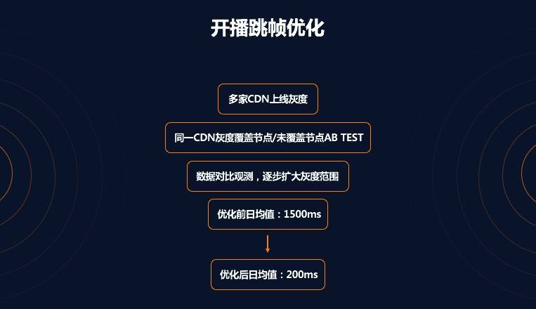 制定了統(tǒng)一的開播數(shù)據(jù)下發(fā)策略之后,在多家 CDN 分別上線灰度,對比觀察各家 CDN 覆蓋節(jié)點(diǎn)和未覆蓋節(jié)點(diǎn)的數(shù)據(jù),然后逐步擴(kuò)大灰度范圍直至全量上線。對比優(yōu)化前的日均值,開播前 10s 跳幀時長從 1500ms 降低至 200ms。