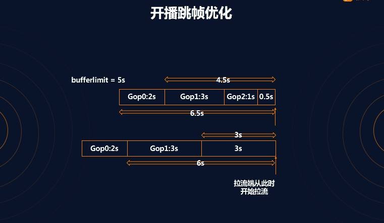 在不違背前面兩點(diǎn)的情況下,下發(fā)盡可能多的數(shù)據(jù)。上圖是兩個根據(jù)服務(wù)端緩存的不同 GOP 結(jié)構(gòu),決定下發(fā)數(shù)據(jù)策略的實(shí)際 case,假設(shè)快手拉流端接收緩沖區(qū)長度是 5 秒: