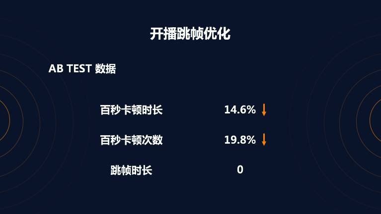 將多余的 200ms 在用戶無感知的情況下,進(jìn)行加速播放,控制緩沖區(qū)的大小。只要將加速程度控制在一定范圍內(nèi),用戶基本是沒有察覺的,而正常播放時長為 200ms 的數(shù)據(jù),經(jīng)過加速,能很快的播放完,之后就恢復(fù)成正常速度播放,這樣就保證了不會再有跳幀的現(xiàn)象,最后的 AB TEST 數(shù)據(jù)顯示開播跳幀時長完全為 0,而卡頓情況也有比較明顯的降低。