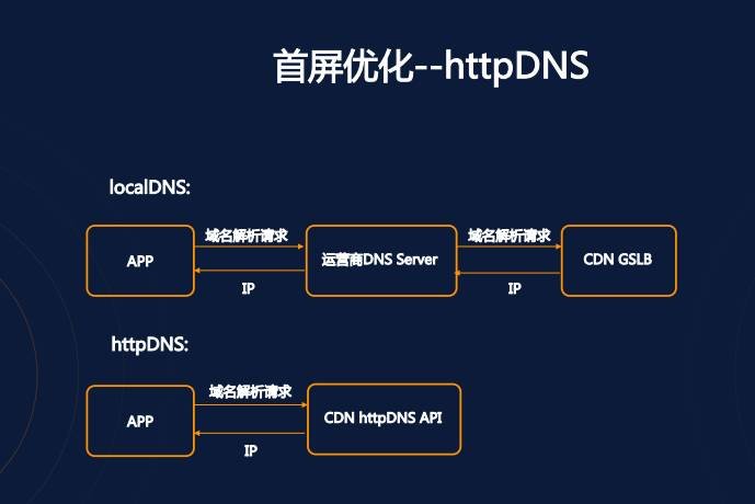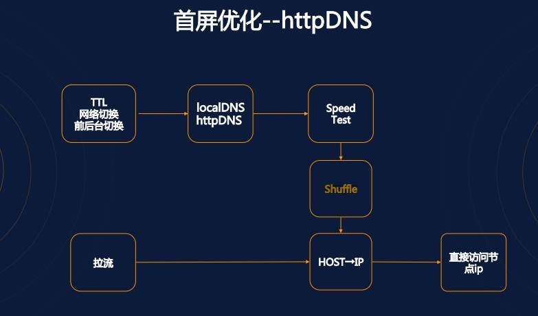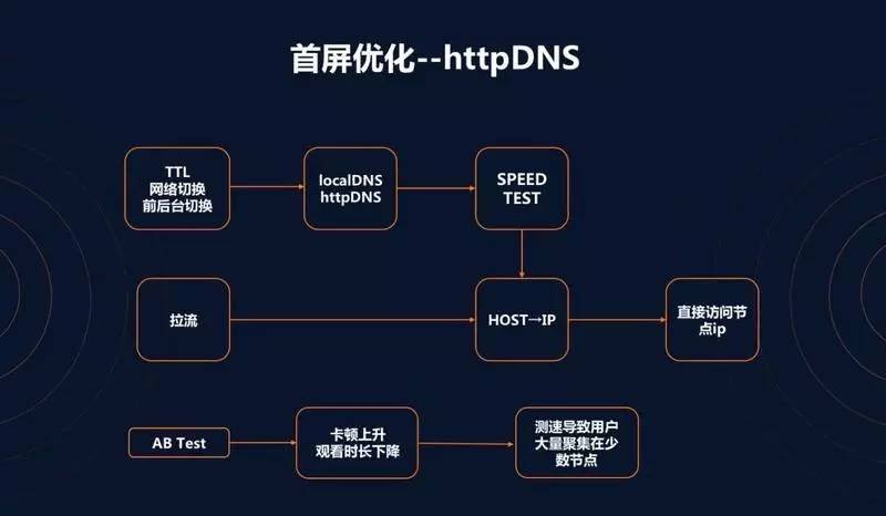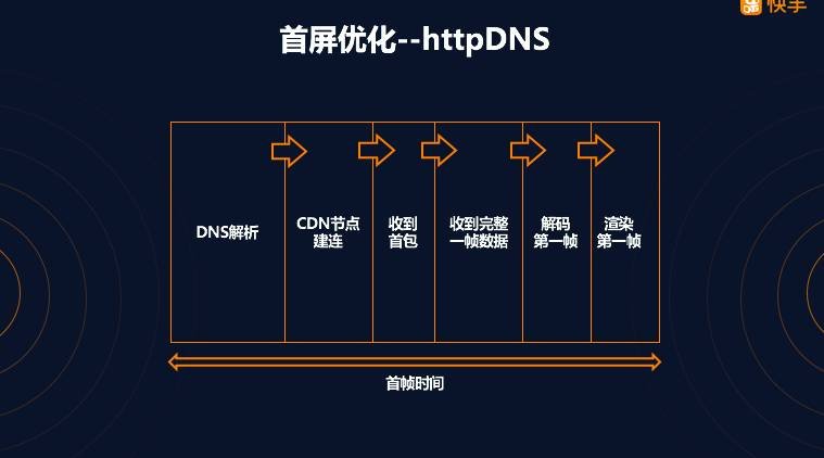 我們要分享的第二個優(yōu)化點(diǎn)是首屏的優(yōu)化,首屏的整個過程,大致可以分為下圖的這六個步驟,快手對各步驟的耗時做了詳盡的分析,分析結(jié)果顯示,DNS 解析其中是最耗時的環(huán)節(jié),因此要降低首屏?xí)r間,必須先降低 DNS 解析時間。