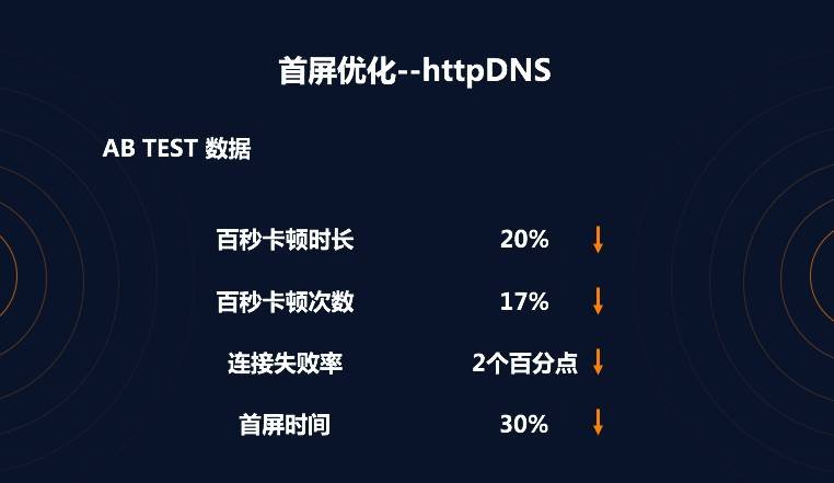 首屏?xí)r間下降了 30%,卡頓也有明顯改善,節(jié)點(diǎn)優(yōu)選的策略使得連接失敗率也下降了 2 個百分點(diǎn)!一個為了優(yōu)化首屏而提出的策略,對多個指標(biāo)都有如此明顯的正向影響,是我們一開始沒有預(yù)料到的。